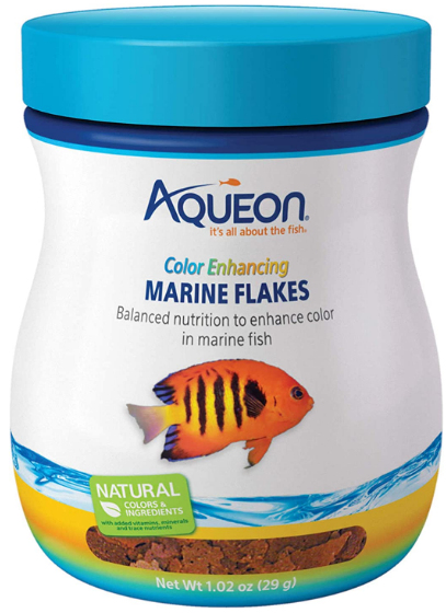 Aqueon Color Enhancing Marine Flakes Fish Food contains spirulina and kelp meal to provide daily nutrition for fish living in a marine (saltwater) environment. The color enhancing formula is a blend of marigold, chili powder, and astaxanthin to help promote brilliant colors in fish.