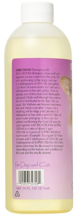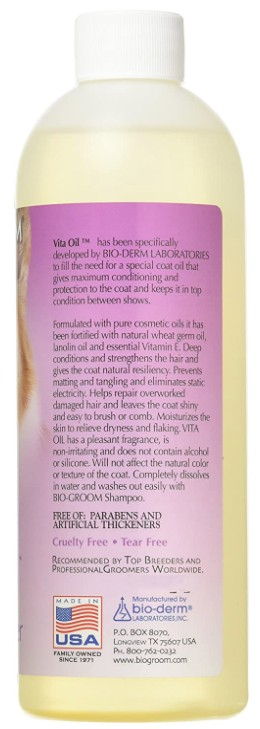 Bio Groom Vita Oil Coat Oil Conditioner has the finest blend of wheat germ oil, lanolin oil, and essential vitamin E. Completely dissolves in water and washes out easily. No alcohol or silicone.