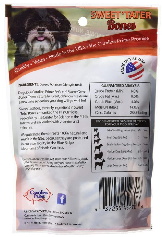 Carolina Prime Sweet Tater Bones are a healthy dog treat made with only 1 ingredient, sweet potatoes. Chock full of essential vitamins and mineral and proudly made in the USA, this is a wholesome, nutritious and delicious treat for dogs of all sizes.