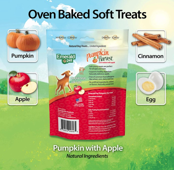 Emerald Pet Pumpkin Harvest oven-baked, low-fat chewy treats are made using pumpkin puree as the first ingredient and do not contain any meat or poultry proteins. They are the perfect solution for dogs with sensitivities or allergies to meat, poultry, or fish proteins. The amazing aroma and taste of our limited ingredient treats, combined with the vegetarian formula, are a great solution for pet parents looking for healthy rewards.