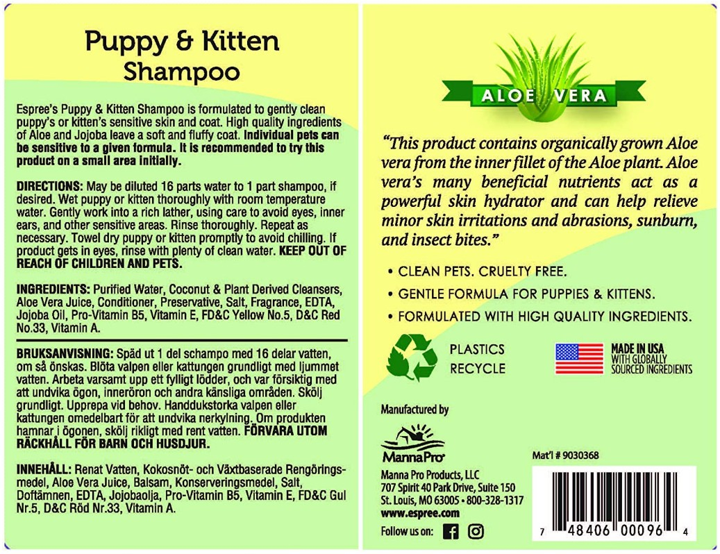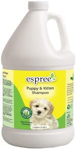 Espree Puppy Shampoo cleans and softens with hypo-allergenic ingredients and gentle cleansers for your puppys sensitive coat and skin. This shampoo is formulated to be gentle and mild for puppies and nursing and pregnant mothers. Natural Aloe Vera and Jojoba leave the coat soft and fluffy, with a long-lasting baby powder fragrance.