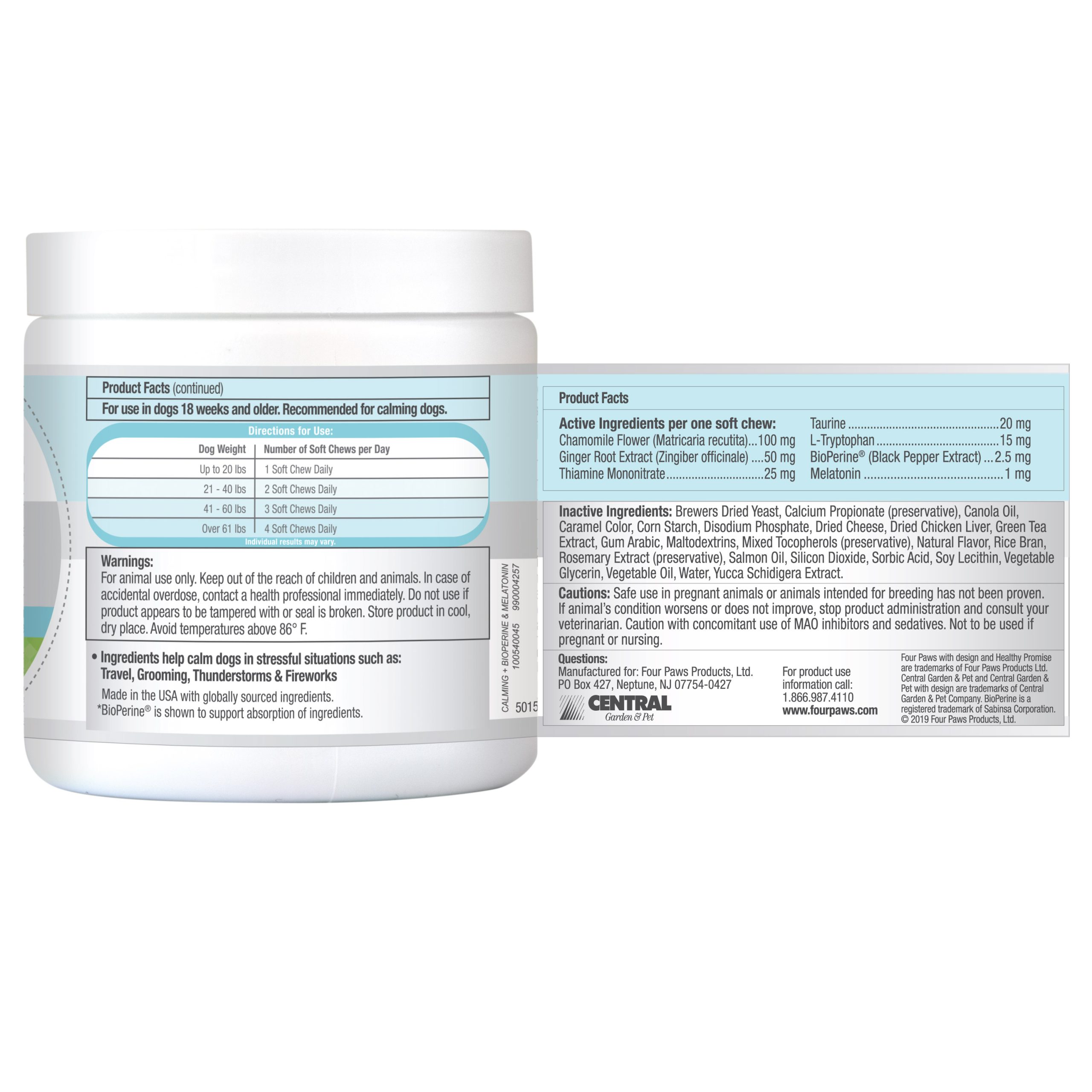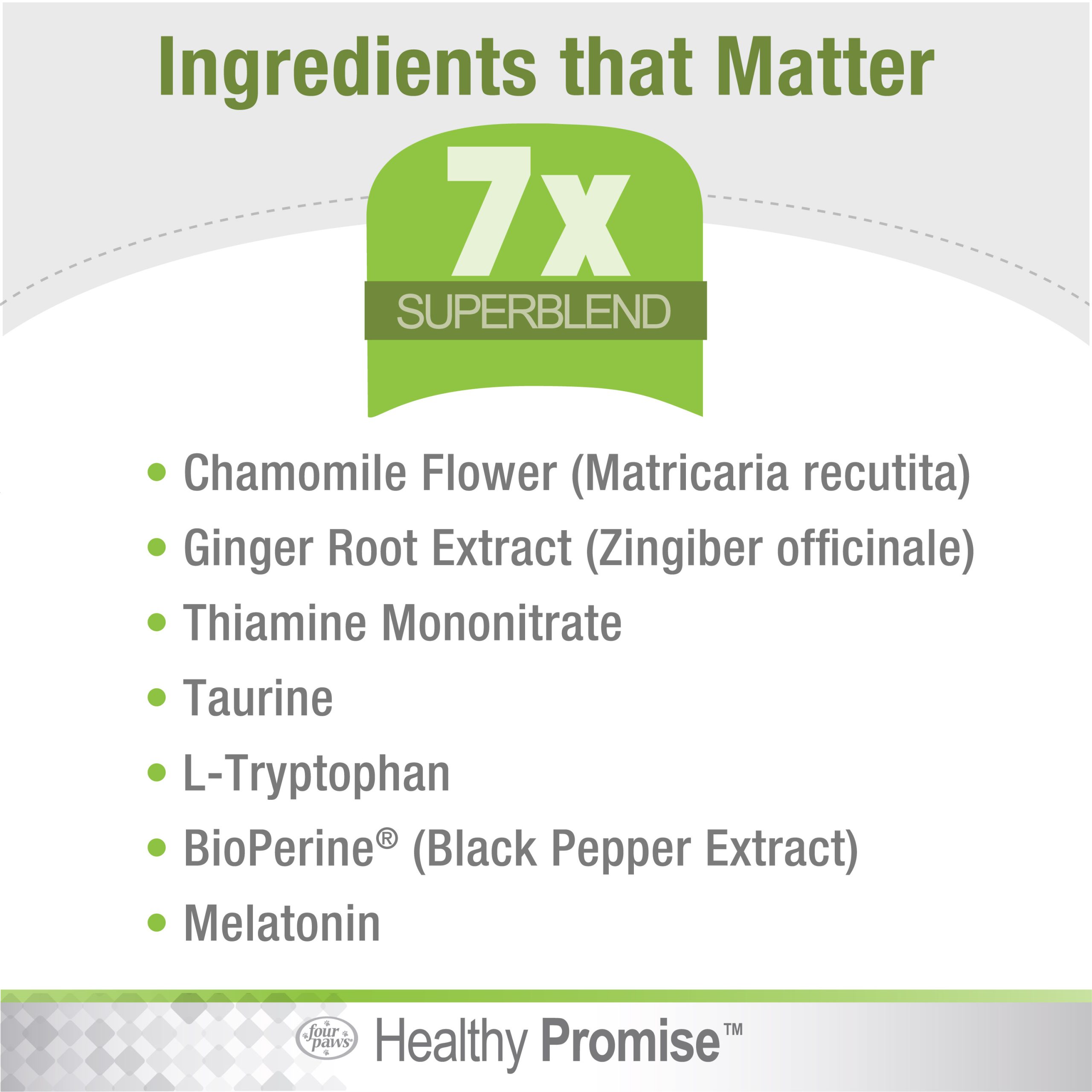 Active Ingredients per 1 Soft Chew: Chamomile (100 mg), Ginger Rood Extract (50 mg), Thiamine Mononitrate (25 mg), Taurine (20 mg), L-Tryptophan (15 mg), BioPerine (2.5 mg), Melatonin (1 mg).