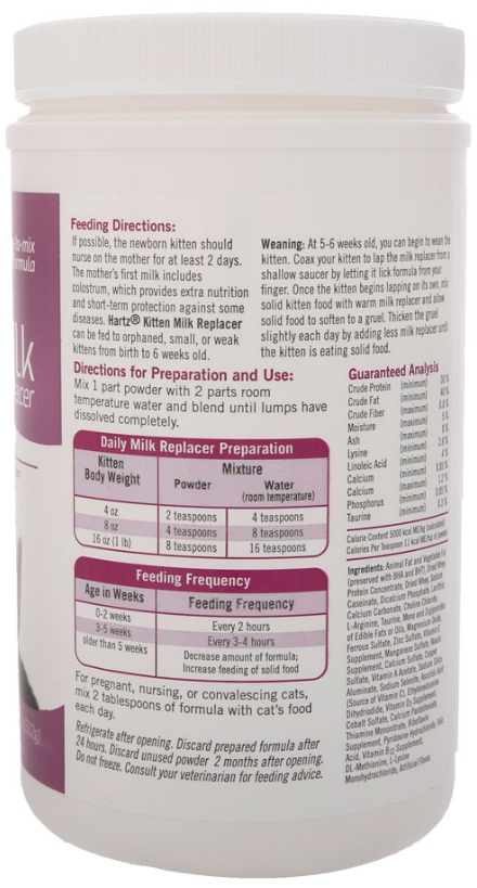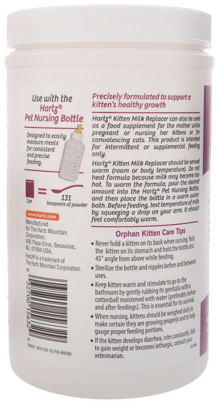 Regular cows milk is not a sufficient source of nutrition for a kitten. Hartz Powdered Kitten Milk Replacer is precisely formulated to emulate mothers milk with the optimal balance of vitamins, minerals, and essential nutrients to support growth and development during the formative first 6 weeks of life. Suitable as a supplement for pregnant, nursing, or convalescing cats and ready for on-demand feeding – just mix with room temperature water. Use with our newborn pet bottle specifically sized for small mouths (sold separately).