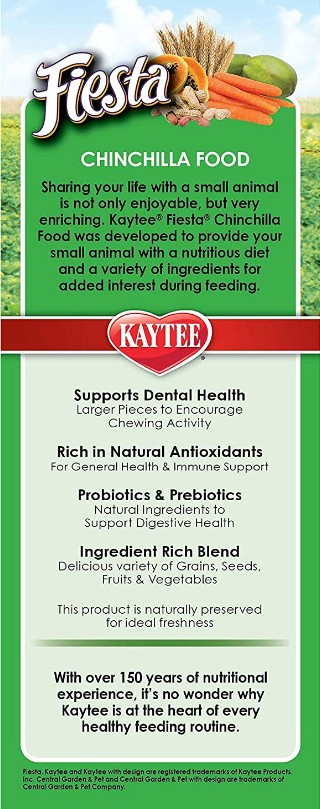Kaytee Fiesta Chinchilla Food features an exciting mixture of quality fruits, nuts, vegetables, specialty seeds and grains create a unique formula to provide all essential nutrients and fantastic flavor for your furry friends. Scientifically formulated and thoroughly tested, Kaytee Fiesta combines colorful shapes, delightful flavors and the widest variety of ingredients to ensure you are feeding your pet what they love.