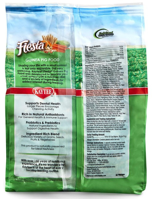Balanced Omega-3 and Omega-6 aid in development of shiny coats. Powerful antioxidants boost immune systems to fight disease. Loaded with essential fiber, Fiesta balances fun food and powerful nutrition. (Note: this product was formerly known as Kaytee Fiesta Max Guinea Pig Food).