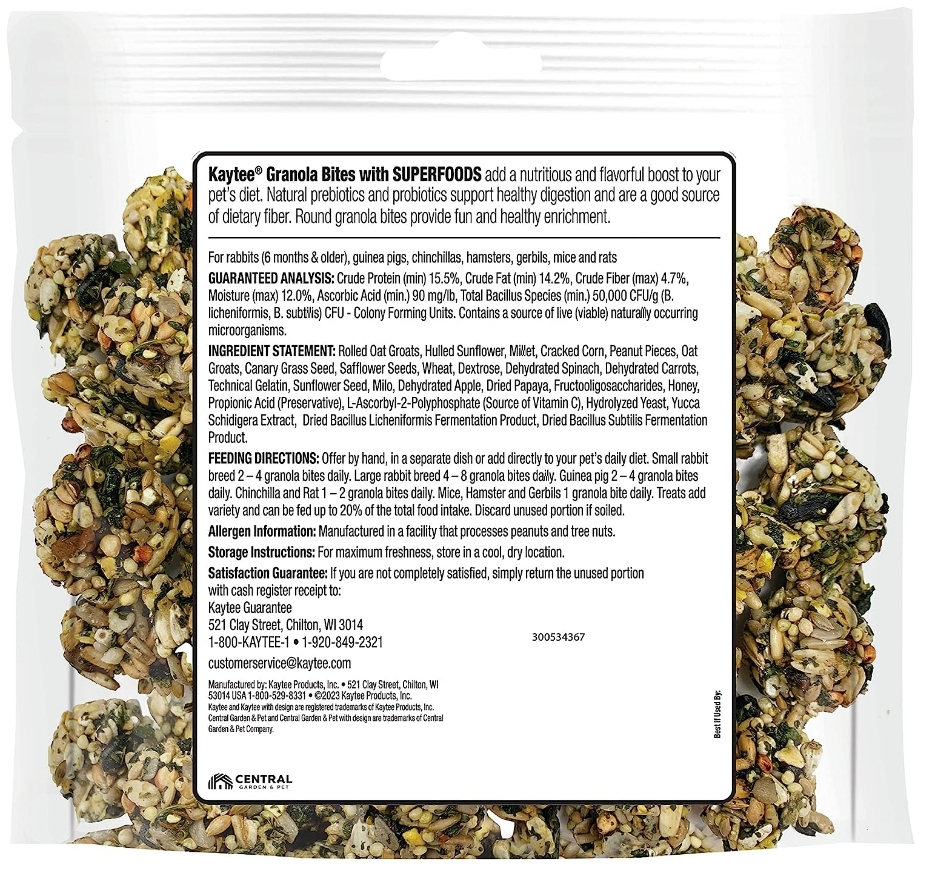 Add some excitement to your pets diet with Kaytee Granola Bites with Superfoods. These scrumptious round bites are packed with natural prebiotics and probiotics that support healthy digestion and provide a good source of dietary fiber. And the best part? Theyre loaded with nutritious superfoods that will leave your furry friend begging for more! With every bite, your pet will enjoy a burst of flavor and fun textures that will make snack time a blast. Plus, the round shape of these granola bites adds a playful element to your pets day, encouraging them to explore and engage with their food. So, if youre looking for a way to add some healthy and fun variety to your pets diet, look no further. These treats are ideal for bonding and playtime with your small animal!.