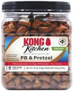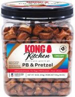 KONG Kitchen PB & Pretzels delivers a crunchy-on-the-outside, creamy-on-the-inside oven-baked real peanut butter snack. At just 4 calories a pop, theyre great for training or any time youd like to show some love. These nuggets are so irresistibly creamy-crunchy-craveable, we put them in a special jar dogs cant open (yet).