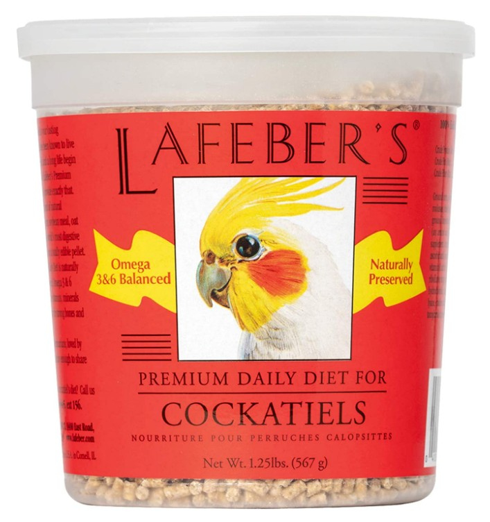 A cockatiel, like many small birds, will happily eat seed day in and day out if given the opportunity; unfortunately, a seed-only diet can shorten his life considerably. Seed is high in fat and lacks the nutrients needed to sustain a long, healthy life. Even seed mixes that are coated with vitamins and minerals fall short of complete nutrition, because once the bird cracks and hulls the seed these benefits are lost. Lafebers Premium Daily Pellets for Cockatiels is a high-quality blend of natural ingredients like ground non-GMO corn and soybean meal. Each pellet contains all the nutrients your cockatiel, conure, quaker parrot, or lovebird needs for a full, energetic, and healthy life. These pellets are flavored with molasses, which enhances taste naturally and improves the acceptance of pellets when finicky seed junkies are converted to a healthy diet. They are perfectly sized for your cockatiel to crumble up and can be offered as a full meal or as an important part of your birds diet.