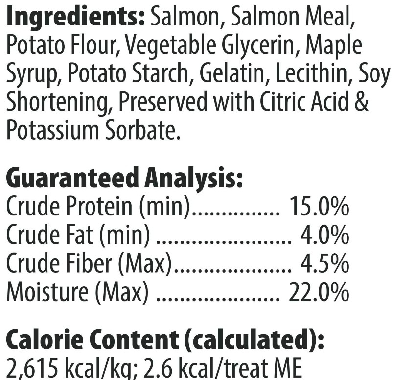 Ingredients: Salmon, Salmon Meal, Potato Flour, Vegetable Glycerin, Maple Syrup, Potato Starch, Gelatin, Lecithin, Soy Shortening, preserved with Citric Acid and Potassium Sorbate.