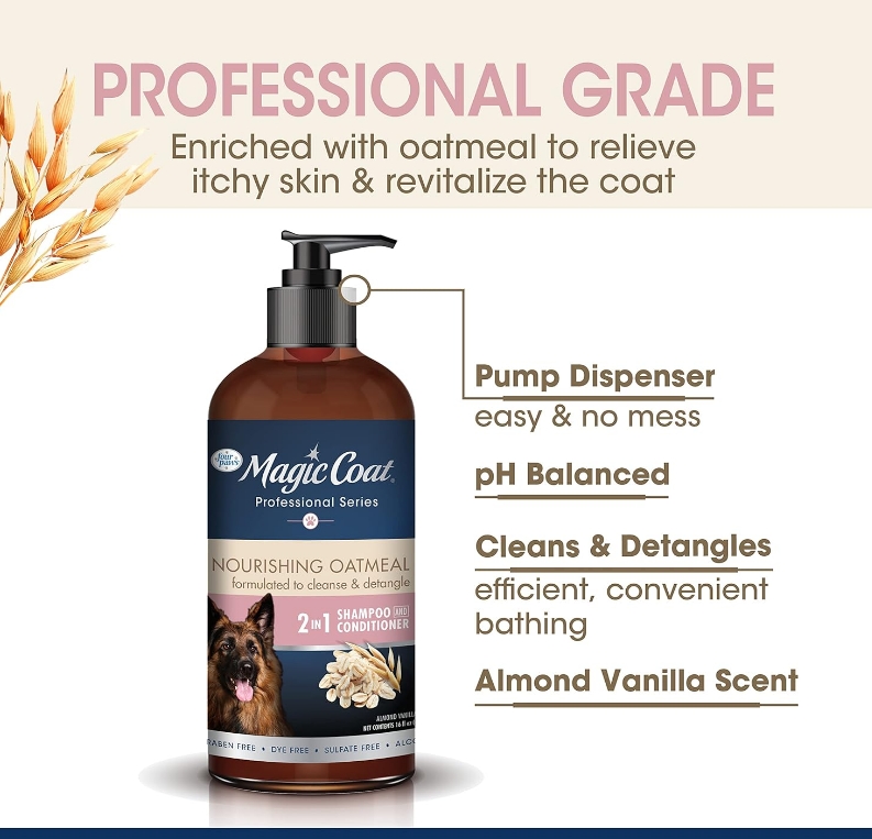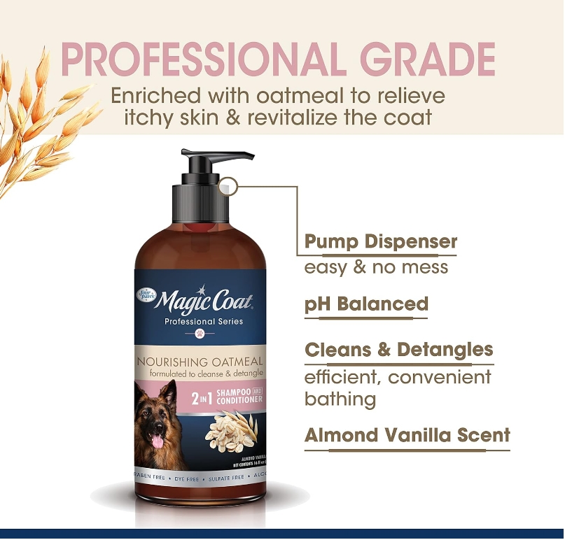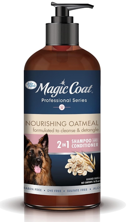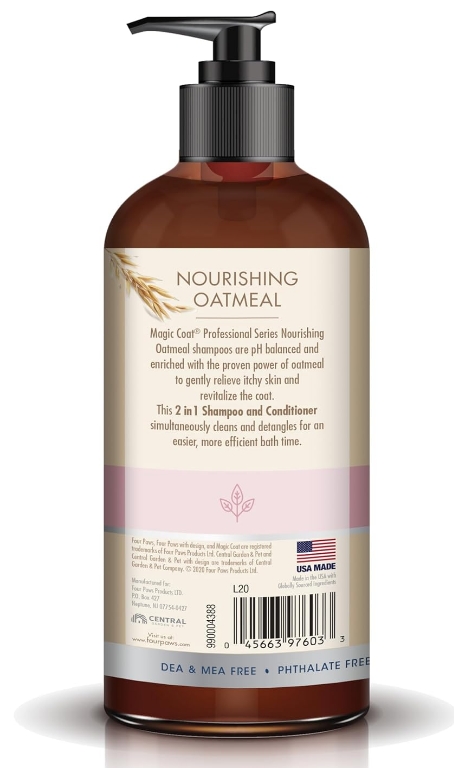 Four Paws has been simplifying at-home pet grooming with the highest-quality tools and products for over 50 years. Make at-home dog grooming a more efficient and blissful experience with Magic Coat Professional Series Nourishing Oatmeal 2 in 1 Dog Shampoo and Conditioner! Enriched with oatmeal to relieve itchiness, this dog shampoo is designed to cleanse and detangle the whole coat. Formulated with a pH-balanced blend of coconut- and plant-based ingredients, this almond vanilla-scented shampoo is free of DEA, MEA, phthalate, parabens, dye, sulfates, alcohol, soap, and silicone. Use this USA-made shampoo on any coat type including cats!.