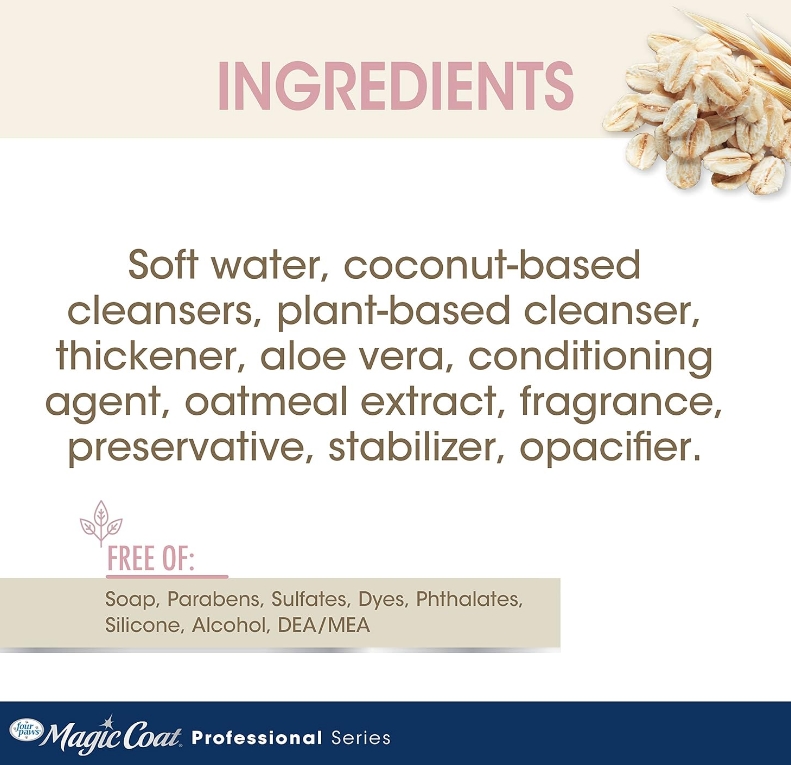 - FINEST-QUALITY INGREDIENTS – pH-balanced dog oatmeal shampoo and conditioner is free of DEA, MEA, phthalate, parabens, dye, sulfates, alcohol, soap, and silicone