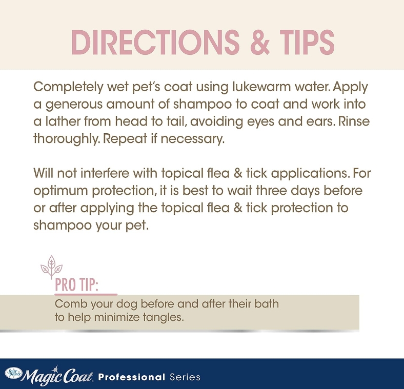 DirectionsCompletely wet pets coat using lukewarm water. Apply a generous amount of shampoo to coat and work into a lather from head to tail, avoiding eyes and ears. Rinse thoroughly. Repeat if necessary. Will not interfere with topical flea & tick applications. For optimum protection, it is best to wait three days before or after applying the topical flea & tick protection to shampoo your pet.