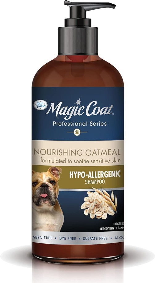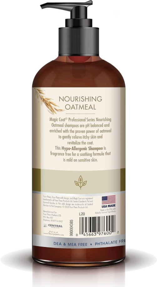 Four Paws has been simplifying at-home pet grooming with the highest-quality tools and products for over 50 years. Enhance your dogs at-home grooming experience with Magic Coat Professional Series Nourishing Oatmeal Hypo-Allergenic Dog Shampoo! This fragrance-free pet shampoo for dogs is enriched with oatmeal to provide itchy skin relief while revitalizing their coats. Formulated with a pH-balanced blend of coconut- and plant-based ingredients, it is free of DEA, MEA, phthalate, parabens, dye, sulfates, alcohol, soap, and silicone. Use this USA-made shampoo on any coat type including cats!.