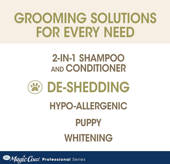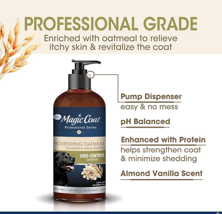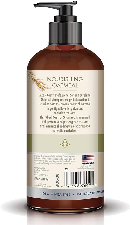 Four Paws has been simplifying at-home pet grooming with the highest-quality tools and products for over 50 years. Provide your dog a luxurious at-home grooming experience with Magic Coat Professional Series Nourishing Oatmeal De-Shedding Dog Shampoo! Enriched with oatmeal to relieve itchiness, this dog shampoo is enhanced with protein to help strengthen the coat and minimize shedding. Formulated with a pH-balanced blend of coconut- and plant-based ingredients, this almond vanilla-scented shampoo is free of DEA, MEA, phthalate, parabens, dye, sulfates, alcohol, soap, and silicone. Use this USA-made shampoo on any coat type including cats!.