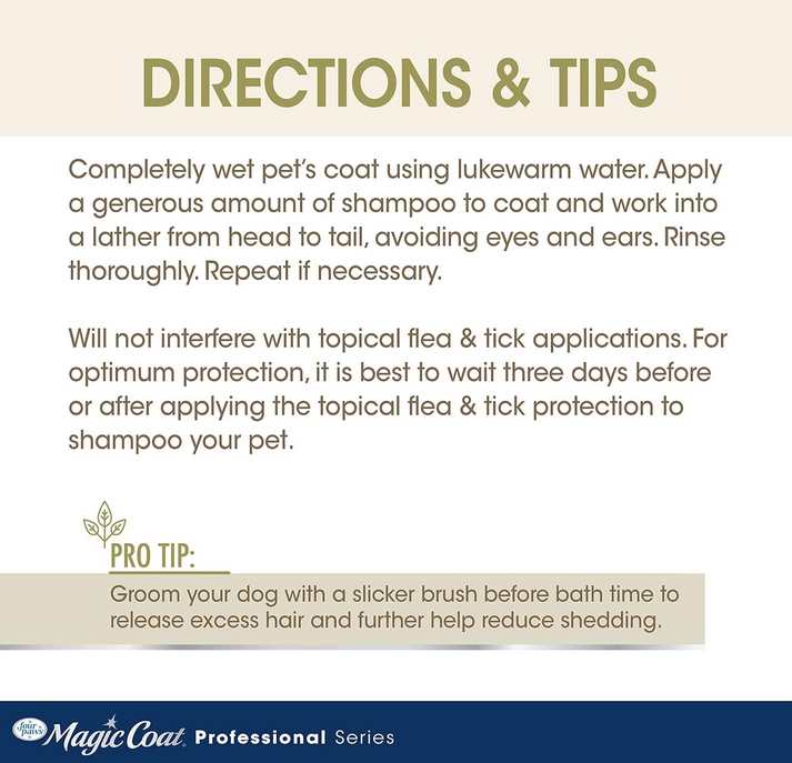 DirectionsCompletely wet pets coat using lukewarm water. Apply a generous amount of shampoo to coat and work into a lather from head to tail, avoiding eyes and ears. Rinse thoroughly. Repeat if necessary. Will not interfere with topical flea & tick applications. For optimum protection, it is best to wait three days before or after applying the topical flea & tick protection to shampoo your pet.