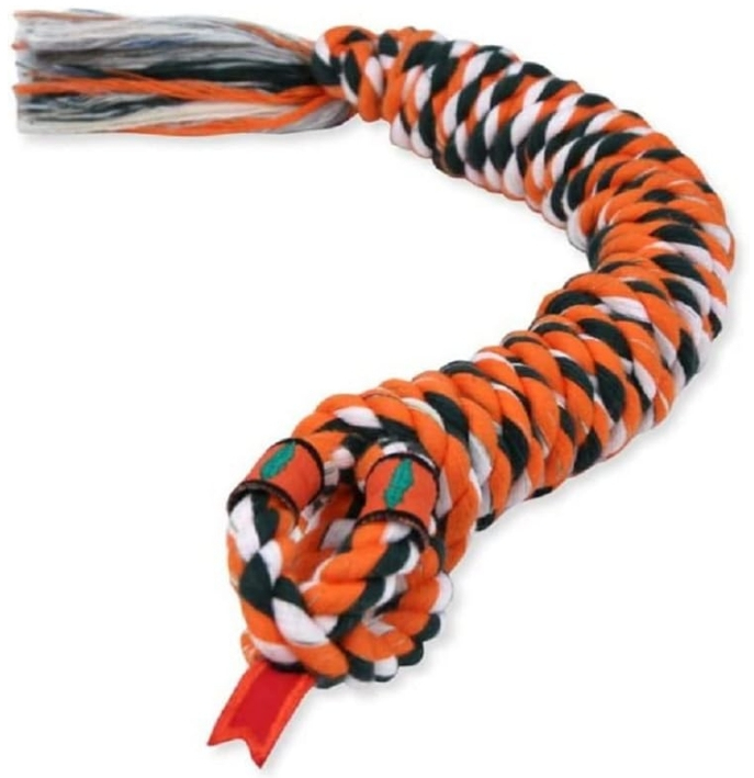 Mammoth Snakebiter Rope Dog Toy is made from premium cotton blend materials in a snake shape creatively crafted, twisted, and tied from one continuous piece of rope for strong chewers. Rope fibers floss dogs teeth while they chew and play.