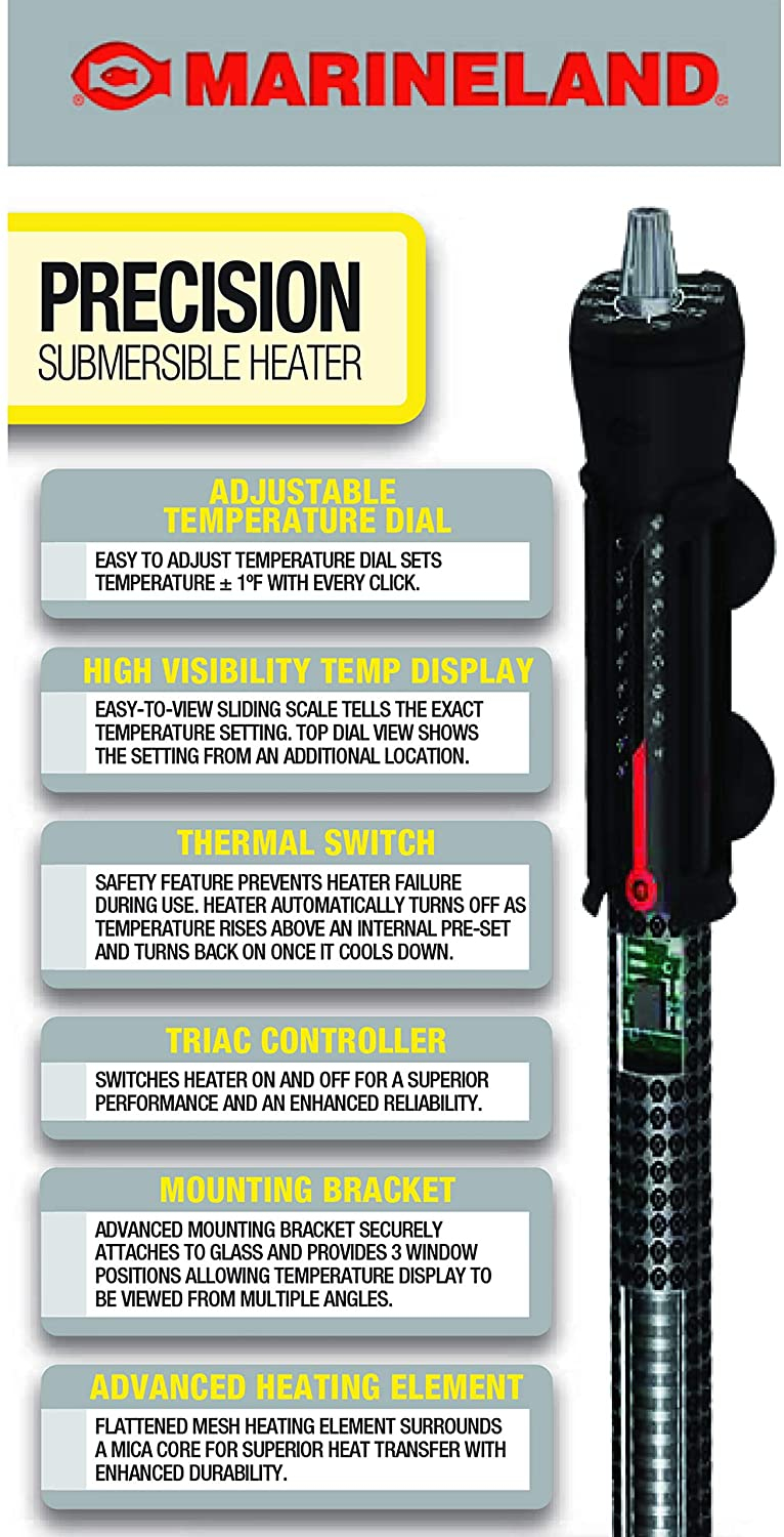 The Marineland Precision Submersible Aquarium Heater offers safe, reliable, highly accurate heating for your fresh or saltwater aquarium. A built-in thermal safety switch accurately regulates the temperature to within 1 degree. The switch also automatically turns the heater off if temperatures exceed internal parameters, and turns it back on when the tank temperature returns to normal. Top and side view temperature scales allow easy viewing from all angles.
