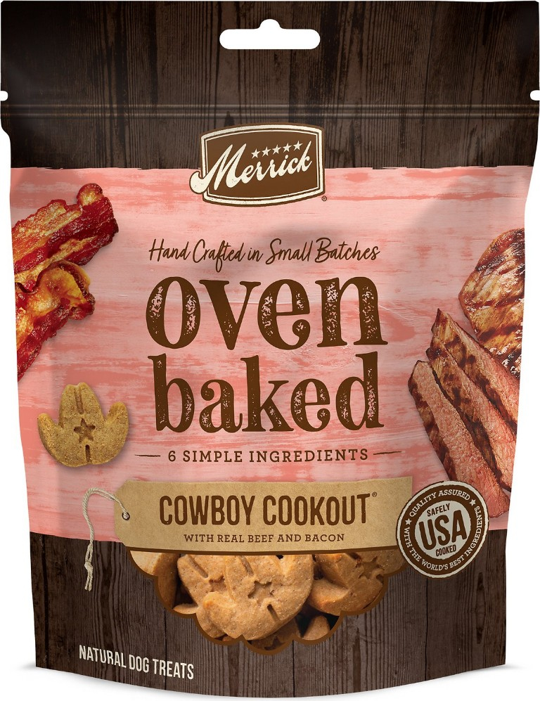 Merrick Cowboy Cookout with Real Beef & Bacon Oven-Baked Dog Treats are hearty and meaty enough to please the hungriest canine cowboy in your herd. Your pup will be one happy camper when you treat him to these mouthwatering biscuits, inspired by a homemade recipe using ingredients you could find in your own kitchen. With only seven ingredients, youll feel good about treating your best buddy to something naturally delicious. Handcrafted in the USA and slowly baked for a satisfying crunch, these bacon-flavored treats are free of corn, wheat, soy, and artificial ingredients.