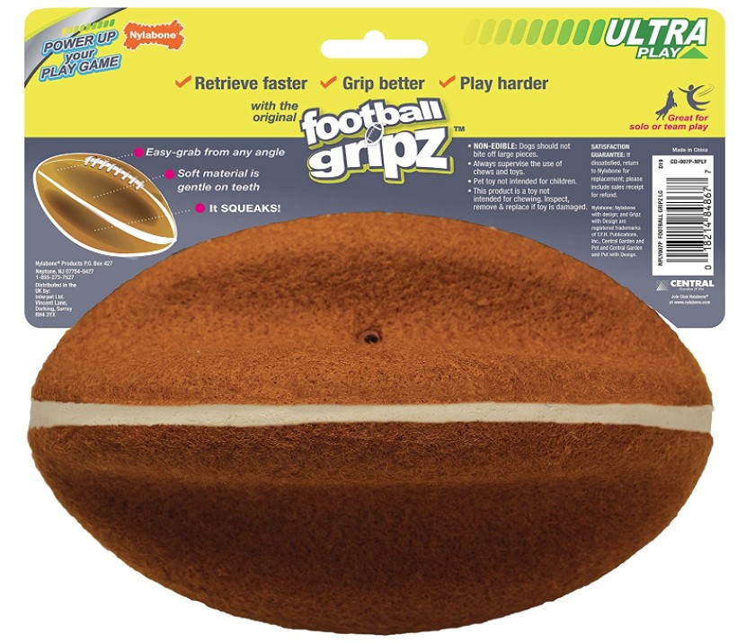 Power up playtime with Power Play Dog Toys from Nylabone! The durable Football Gripz is ideal for pet parents looking for a new and exciting take on a classic football for dogs. Strategically created with our four-legged friends in mind, this ball toy for dogs is designed with an innovative indented shape that is easy for both you and your dog to catch, pick up, and carry from any angle. Made of soft material that is gentle on teeth, this dog football toy can be thrown up to 100 feet!.