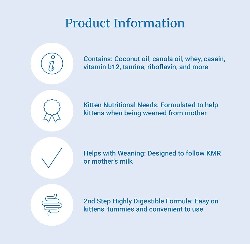 KMR 2nd Step has been formulated to meet the nutritional needs of young kittens being weaned from mother, or orphaned bottle fed kittens progressing to solid foods. For best results, the product should be mixed with ready to feed liquid or reconstituted powder KMR to give the consistency necessary to get good food consumption. If KMR is not available, water may be used. Fresh, clean water should always be available for drinking.